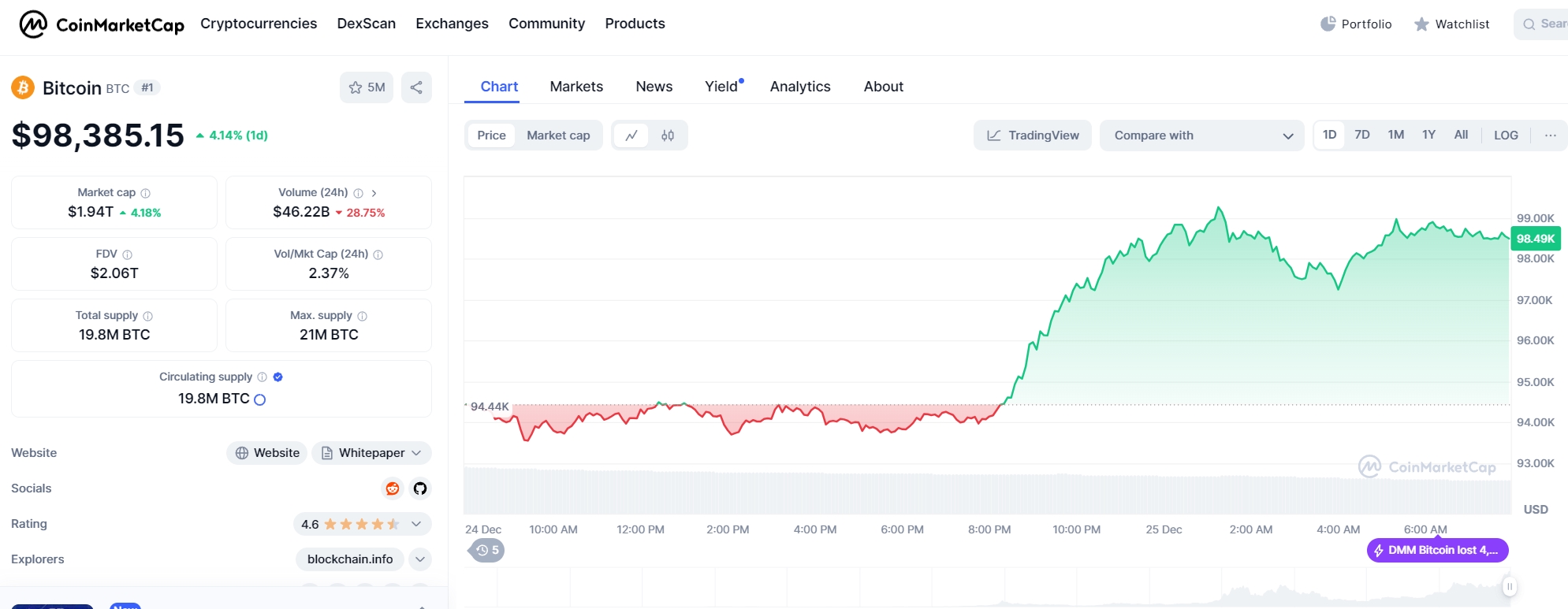 Harga Kripto Hari Ini, Rabu 25 Desember 2024, Harga Bitcoin dan Solana Stabil di $98.388